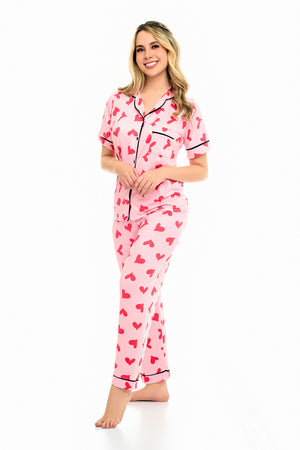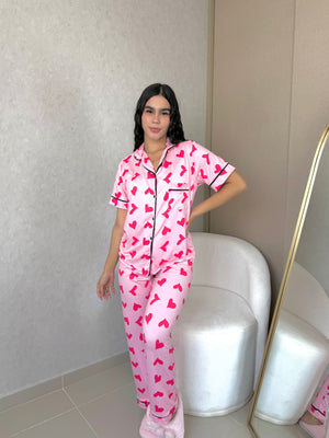 Pijama botones pantalón largo print estampado rosa corazones rojos