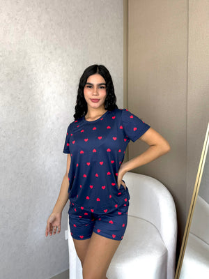 Pijama Referencia Total Estampado Azul Oscuro Corazones Rojos